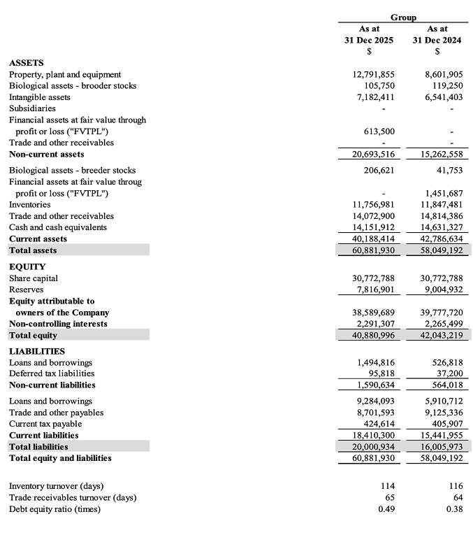 Total assets (Group) as at 31 December 2025 were $60.9 million, increased by approximately $2.9 million from $58.0 million as at 31 December 2024.